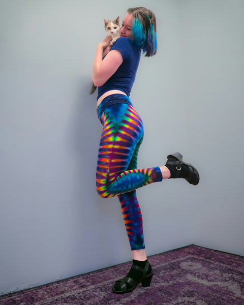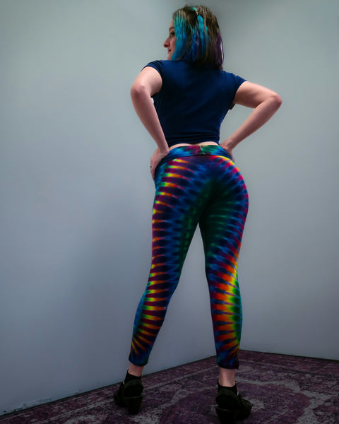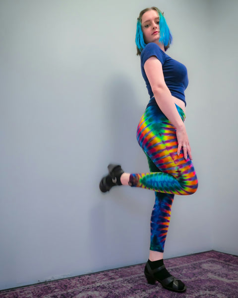 Made of our very favorite 95% Cotton 5% Spandex material, these new LEGGINGS look SMASHING on everybody. Get ready to light up the room with your one-of-a-kind, 100% Hand Tie Dyed in America, LED Light reactive, stretchy, comfortable pants for every activity from Yoga to Dancing or just chillin' at home! All of Dimples' Dyes are guaranteed to Not Fade Away, colors remain vibrant for the life of the clothing... even longer. Order a size up, we triple wash these puppies in hot water so you wont shrink them any more than we already have! American Apparel Brand.